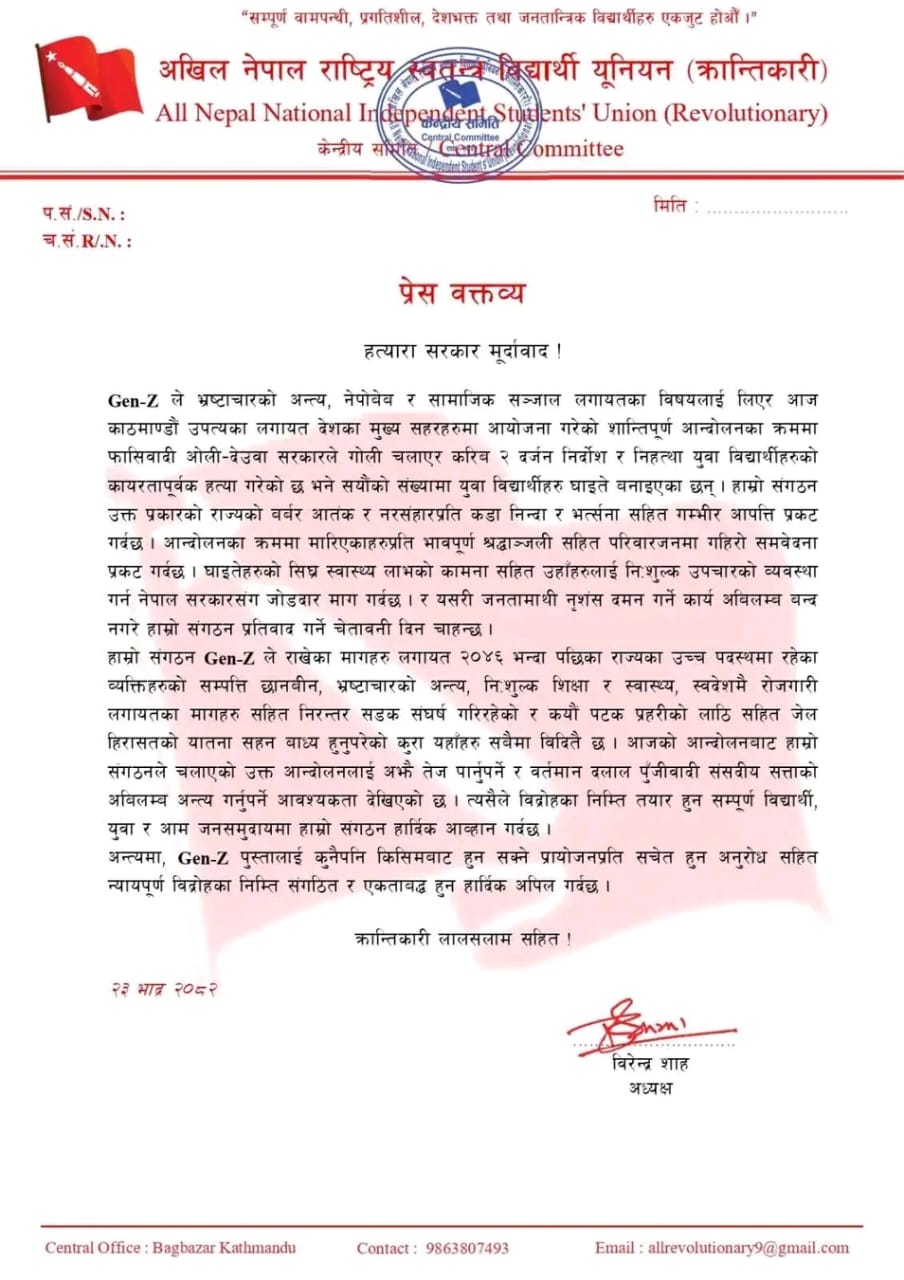 संगठनका केन्द्रीय अध्यक्ष विरेन्द्र शाहले सोमवार जारी गरेको प्रेस वक्तव्यमा मारिएका विद्यार्थीप्रति भावपूर्ण श्रद्धाञ्जली अर्पण गर्दै, परिवारजनप्रति गहिरो समवेदना व्यक्त गरिएको छ। साथै घाइतेहरूको शीघ्र स्वास्थ्यलाभको कामना गर्दै, नेपाल सरकारसँग तिनको निःशुल्क उपचारको तत्काल व्यवस्था गर्न जोडदार माग गरिएको छ।