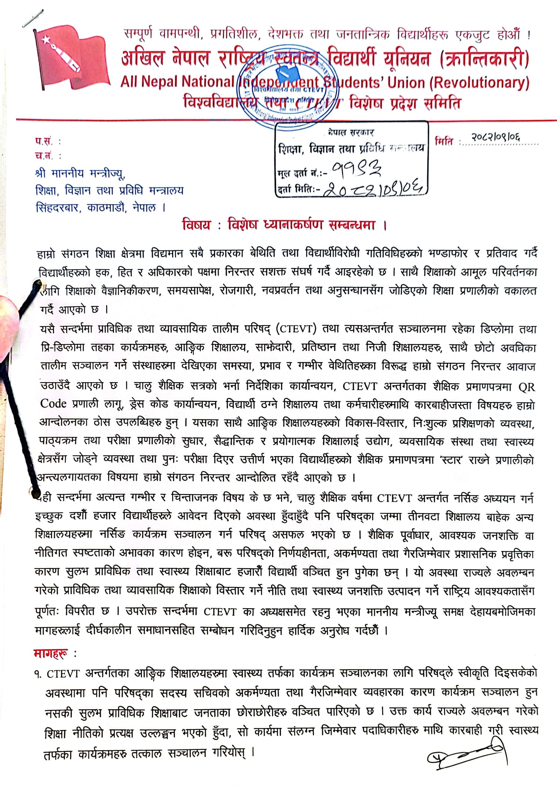 शिक्षामन्त्री पुन समक्ष अखिल (क्रान्तिकारी) बहुमतको ९ बुँदे ध्यानाकर्षणपत्रमा के छ ?