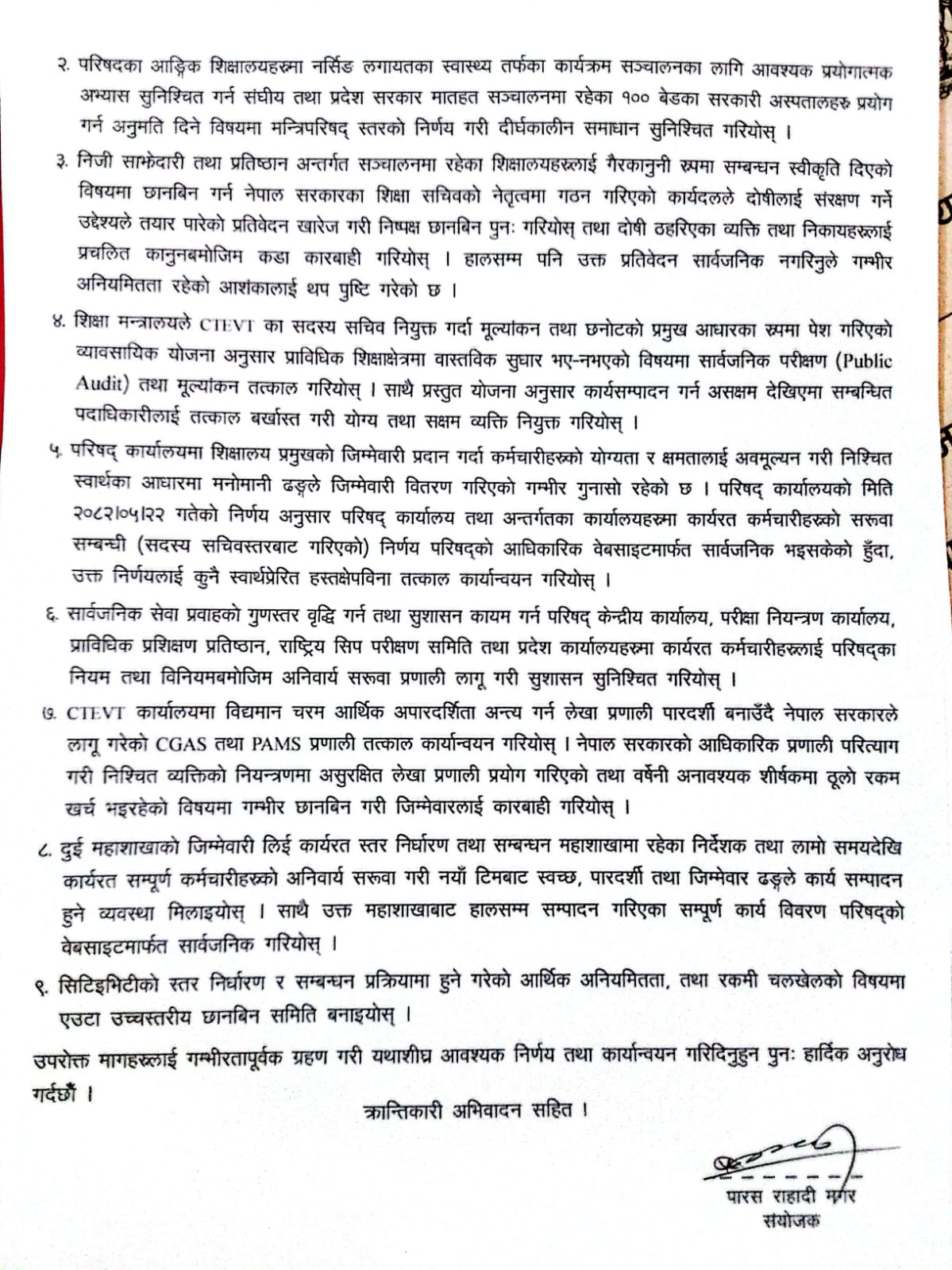 यसका साथै परिषद् कार्यालयमा मनोमानी ढङ्गले जिम्मेवारी वितरण गरिएको, सरूवा प्रणालीको अवमूल्यन गरिएको, चरम आर्थिक अपारदर्शिता कायम रहेको, सिजिएएस तथा प्याम्स प्रणाली कार्यान्वयन नगरिएको तथा स्तर निर्धारण र सम्बन्धन प्रक्रियामा आर्थिक चलखेल हुने गरेको आरोप लगाउँदै उच्चस्तरीय छानबिन समिति गठन गरी सुशासन सुनिश्चित गर्नुपर्ने माग ध्यानाकर्षण पत्रमा समेटिएको छ ।