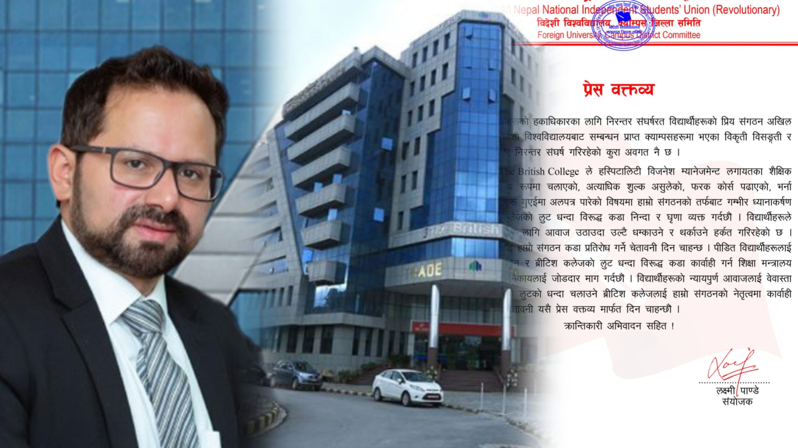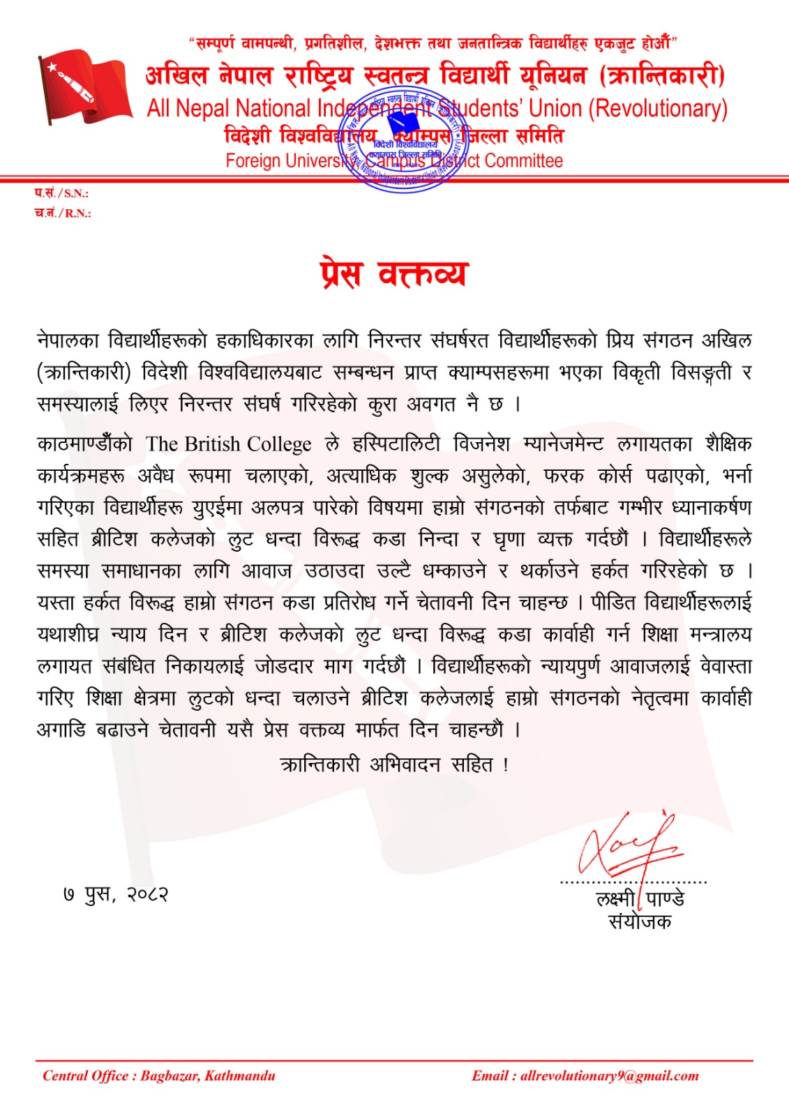 ब्रिटिश कलेजले विद्यार्थीमाथि लुटपाट गरेको भन्दै अखिल (क्रान्तिकारी) बहुमतको कडा चेतावनी