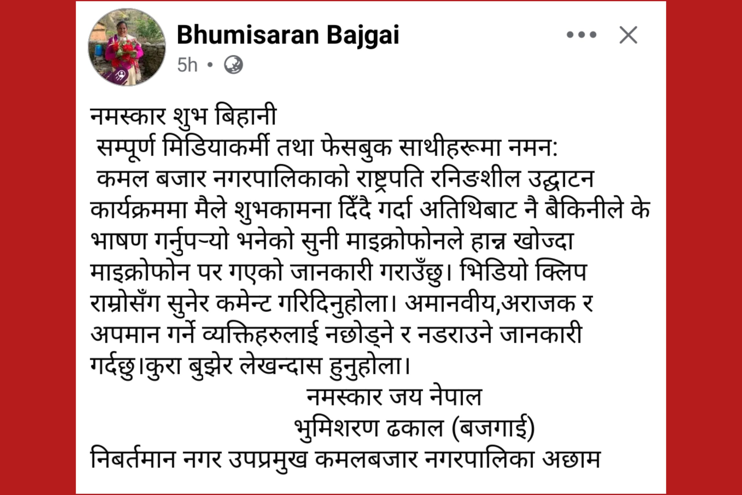 पूर्व उपप्रमुख भुमिसरण ढकालले (बजगाई) उक्त घटनाप्रति आफ्नो स्पष्टिकरण दिँदै भनिन् कि उद्घाटन समारोहमा मन्तव्य दिने क्रममा एक अतिथिबाट अपमानजनक टिप्पणी आएको थियो। त्यसै क्रममा अवाञ्छित परिस्थिति सिर्जना हुँदा माइक पर गएको ढकालले बताइन्।