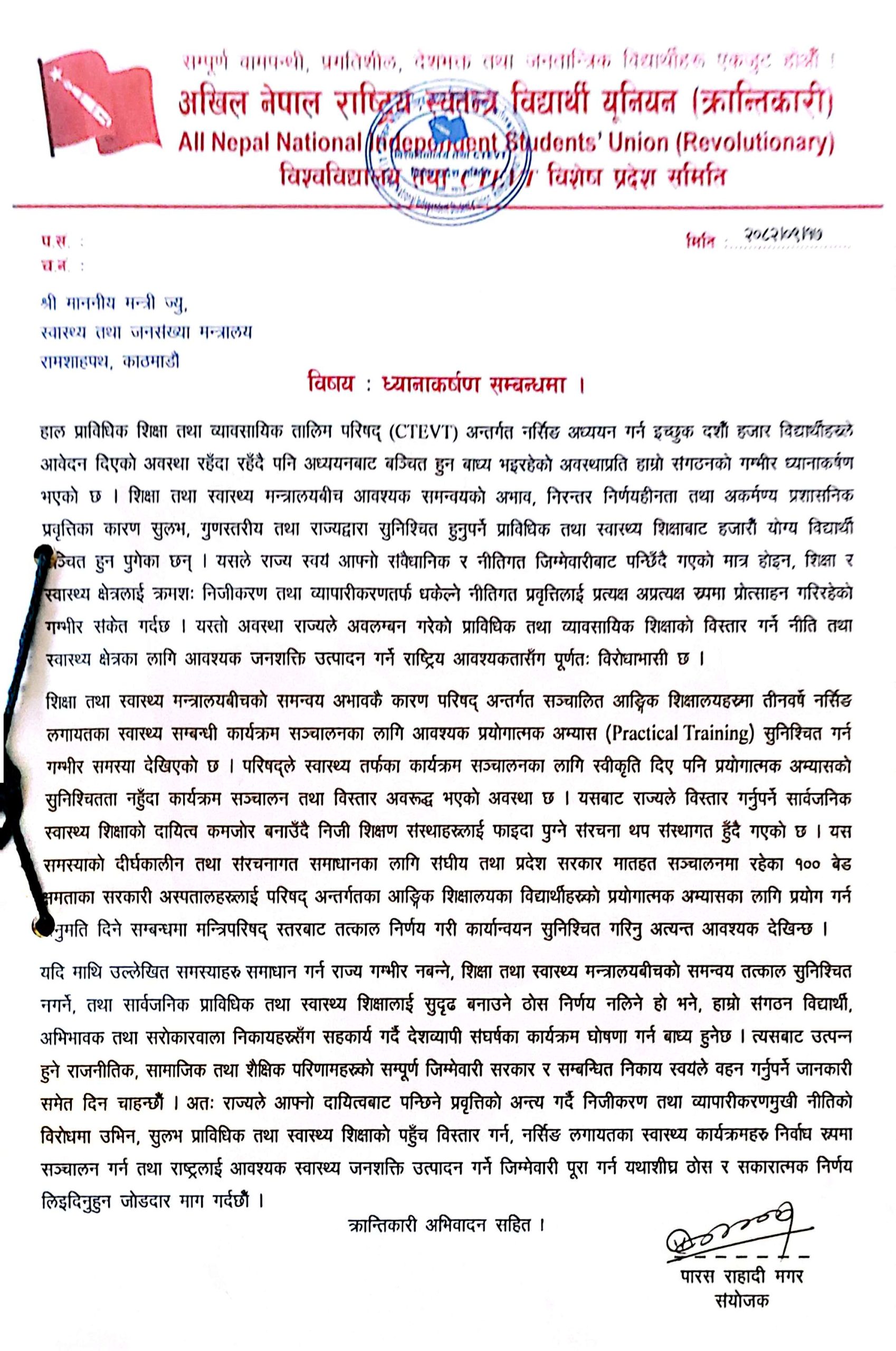 अखिल (क्रान्तिकारी)ले माग गरेको छ कि संघीय र प्रदेश सरकार मातहत सञ्चालित कम्तीमा १०० बेड क्षमताका सरकारी अस्पतालहरूलाई अभ्यासका लागि तुरुन्त प्रयोगमा ल्याइयोस् । यदि राज्य गम्भीर नबन्ने हो भने विद्यार्थी, अभिभावक र सरोकारवाला निकायसँग सहकार्य गर्दै देशव्यापी संघर्षका कार्यक्रम घोषणा गर्न संगठन बाध्य हुने चेतावनी समेत पत्रमा दिइएको छ ।