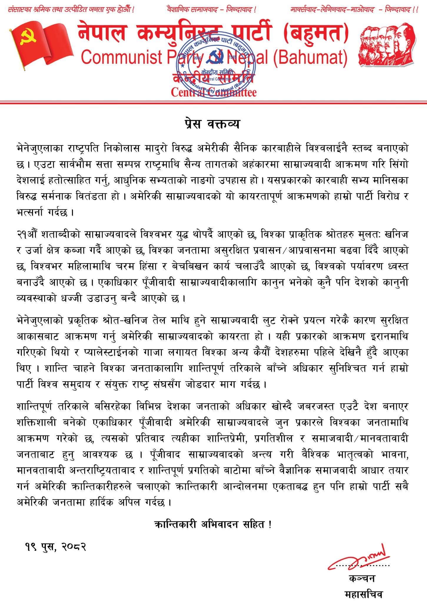 पार्टीले भेनेजुएलाको तेल र खनिज स्रोतमा हुने साम्राज्यवादी लुट रोक्ने प्रयासका कारण गरिएको अमेरिकी आक्रमणलाई कायरता भनेको छ । यसअघि इरान, प्यालेस्टाइनको गाजा लगायत अन्य देशहरूमा पनि यस्ता आक्रमण भइरहेका थिए ।